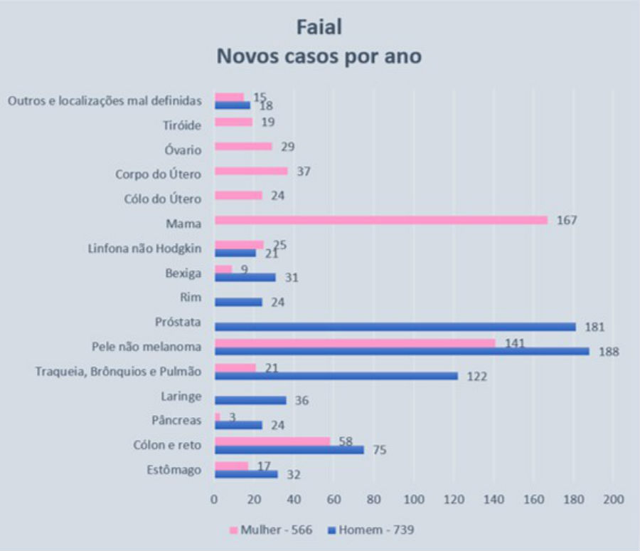 Dos novos casos 739 referem-se aos homens e 566 às mulheres, sendo que os cancros mais frequentes nos homens são o da próstata e o da Traqueia, Brônquios e Pulmão, com 181 e 122 novos casos respetivamente e nas mulheres o cancro da Mama, com 167 casos e do Colo e Reto, com 58 casos são os mais diagnosticados.