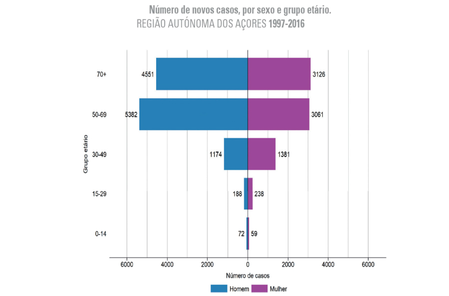 O estudo conclui ainda que o grupo etário dos 50 aos 69 anos foi o que registou o maior número de novos casos nos homens, enquanto que nas mulheres foi o grupo etário dos 70+ anos e que em qualquer uma das localizações, o risco de contrair a doença foi sempre maior nos homens do que nas mulheres.