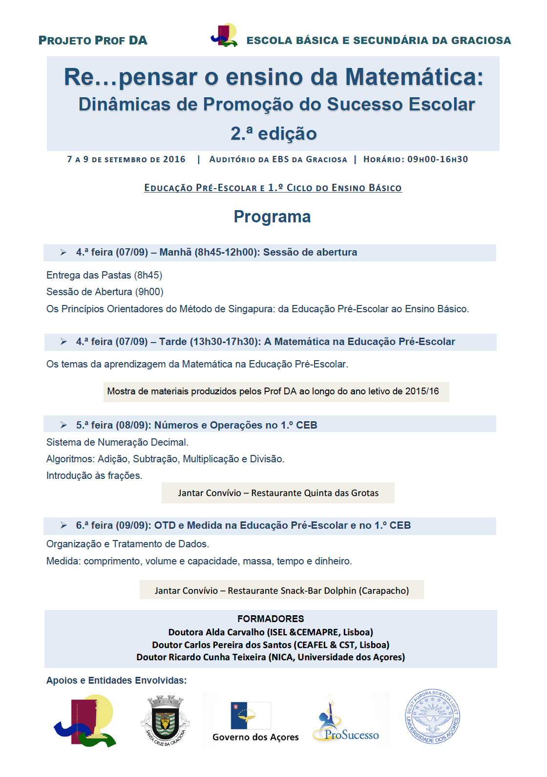 Decorre desde o início do ano letivo de 2015/16 a oficina de formação “Matemática Passo a Passo: Estratégias de Superação de Dificuldades para o 1.º Ciclo do Ensino Básico”, uma parceria entre a Universidade dos Açores e a Secretaria Regional da Educação e Cultura do Governo dos Açores, no contexto do programa ProSucesso – Açores pela Educação. Nesta oficina participam os cerca de 50 professores DA (professores qualificados na deteção, caracterização e resolução de dificuldades de aprendizagem no 1.º Ciclo do Ensino Básico), provenientes de todas as unidades orgânicas da Região que ministram o 1.º Ciclo, cuja ação no ano letivo de 2015/16 incidiu na superação de dificuldades a Matemática no 1.º ano de escolaridade, em estreita cooperação com os professores titulares. No ano letivo de 2016/17, a intervenção dos Prof DA irá incidir no 2.º ano de escolaridade, dando assim continuidade ao projeto Prof DA. A ação do professor DA tem por base estudos provenientes das neurociências cognitivas, que explicam como o nosso cérebro aprende Matemática, e alguns casos de sucesso do ensino da Matemática no Mundo, como é o exemplo da Finlândia, com um sistema de apoio de características similares, e de Singapura, que nos apresenta centenas de pequenos pormenores de ordem científica e didática amplamente testados em vários países. Um objetivo fundamental do Projeto Prof DA, no contexto do ensino da Matemática, centra-se na promoção de aprendizagens mais significativas, estimulando o cálculo mental, o raciocínio matemático e a resolução de problemas. Não se pode gostar daquilo que não se compreende. Daí que as estratégias promovidas visem uma compreensão profunda da matemática elementar. Esta meta só pode ser alcançada com a energia e o apoio de todos, desde os professores titulares e de apoio aos encarregados de educação. Outro aspeto de grande relevância prende-se com a necessária articulação entre os diferentes níveis de ensino, em particular entre a Educação Pré-Escolar e o 1.º Ciclo do Ensino Básico e entre o 1.º Ciclo do Ensino Básico e o 2.º Ciclo do Ensino Básico. Um ensino da Matemática eficaz processa-se sem saltar etapas, sendo um tema introduzido apenas quando os conteúdos necessários para a exploração desse tema estão devidamente consolidados. Das estratégias implementadas, destaca-se a abordagem CPA (Concreto-Pictórico-Abstrato): 1.º manipulação de objetos; 2.º substituição por esquemas que os representam; 3.º utilização de numerais e de outros símbolos matemáticos. De salientar também a abordagem em espiral de conceitos, competências e processos, a exploração dos conceitos segundo múltiplas perspetivas e múltiplas representações, a construção e disponibilização de materiais adequados (jogos, fichas de trabalho para o aluno, guia de apoio ao professor), entre outros aspetos. Das várias iniciativas organizadas pelo grupo de 50 professores DA da Região, destaca-se o ciclo de eventos “Re...pensar o ensino da Matemática: Dinâmicas de promoção do sucesso escolar”. A 1.ª edição realizou-se entre 4 e 6 de julho de 2016, na EBS de Vila Franca do Campo, e reuniu mais de 150 participantes. Com este ciclo de eventos, pretende-se contemplar as diferentes ilhas do Arquipélago com momentos de partilha das novas estratégias de aprendizagem da Matemática. A 2.ª edição já tem data marcada: decorrerá de 7 a 9 de setembro de 2016, no Auditório da EBS da Graciosa. Esta é uma iniciativa da professora DA Regina Silva, da EBS da Graciosa, que conta com o apoio e participação dos educadores de infância e dos professores dos 1.º e 2.º ciclos do ensino básico da EBS da Graciosa. Contará também com a participação de alguns professores DA da Região. Este evento tem a duração de 19 horas, distribuídas por 3 dias, e conta como oradores principais com o Professor Doutor Carlos Pereira dos Santos, do Centro de Análise Funcional, Estruturas Lineares e Aplicações da Universidade de Lisboa, e com a Professora Doutora Alda Carvalho, do Instituto Superior de Engenharia de Lisboa. A manhã do primeiro dia será dedicada a uma comunicação de abertura, “Os Princípios Orientadores do Método de Singapura: da Educação Pré-Escolar ao Ensino Básico”, destinada ao público em geral. O restante programa contempla temas específicos para os educadores de infância e professores do 1.º ciclo do ensino básico (os temas da aprendizagem da Matemática na educação pré-escolar; jogos para a educação pré-escolar; sistema de numeração decimal; algoritmos da adição, subtração, multiplicação e divisão; introdução às frações; organização e tratamento de dados; medida – comprimento, volume e capacidade, massa, tempo e dinheiro) e para os professores do 2.º ciclo do ensino básico (isometrias e simetrias: explorações no GeoGebra; jogos do Campeonato Nacional/Regional de Jogos Matemáticos; o modelo de barras e a resolução de problemas; frações no 2.º ciclo do ensino básico). Na tarde do dia 7 de setembro, o grupo de professores DA organizará uma exposição de materiais desenvolvidos no decorrer do ano letivo de 2015/16. Dado o sucesso desta iniciativa, já estão previstas novas edições do “Repensar”! Esta é a prova que o Projeto Prof DA está a ter um impacto significativo na Região. Sinal disso são as melhorias registadas na aprendizagem, expressas no decréscimo de 17 para 10% e de 26 para 21% nas menções de insuficiente e de suficiente, respetivamente, e no acréscimo de 30 para 33% e de 28 para 36% das menções de bom e muito bom, resultados relativos ao 1.º ano de escolaridade do ano letivo de 2015/16 quando comparado com o ano letivo anterior. Departamento de Matemática da Universidade dos Açores, Este endereço de email está protegido contra piratas. Necessita ativar o JavaScript para o visualizar.