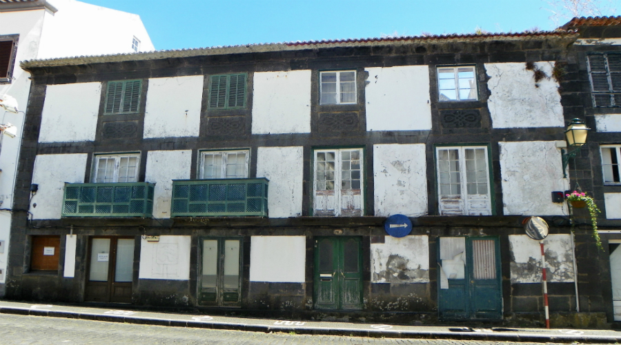 Imagem: Este edifício (Rua Walter Bensaude 11), construído provavelmente no século XVII e bem conhecido dos historiadores de Arte e de Arquitectura, é um dos mais antigos da cidade, com uma estrutura tradicional em cantaria de pedra basáltica, janelas de madeira e varandas “de ralos” (das poucas sobreviventes). É também um dos imóveis em maior risco, visto estar em muito mau estado e já parcialmente em ruína.